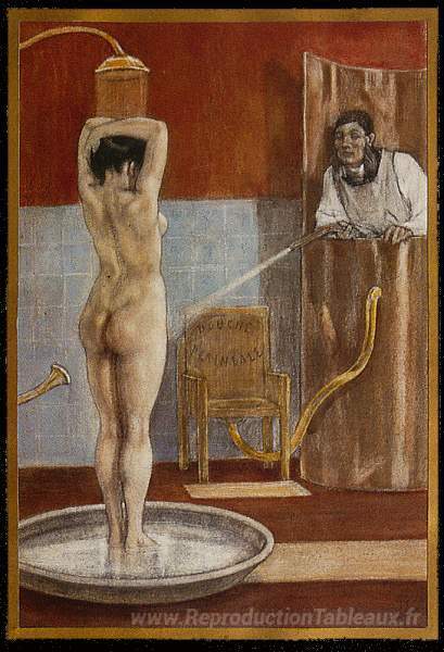 Nous vous proposons une reproduction artisanale sur toile du célèbre tableau 'La douche' de Felicien Rops, provenant du Musée de la Reproduction.