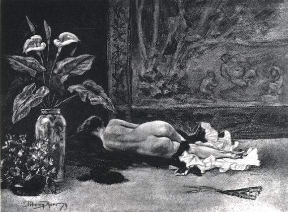 Nous vous proposons une reproduction artisanale sur toile du célèbre tableau 'La sieste' de Felicien Rops, provenant du Musée de la Reproduction.