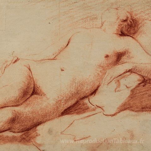 Nous vous proposons une reproduction artisanale sur toile du célèbre tableau 'Liegder Weiblicher Akt' de Johann Anton de Peters, provenant du Musée de la Reproduction.