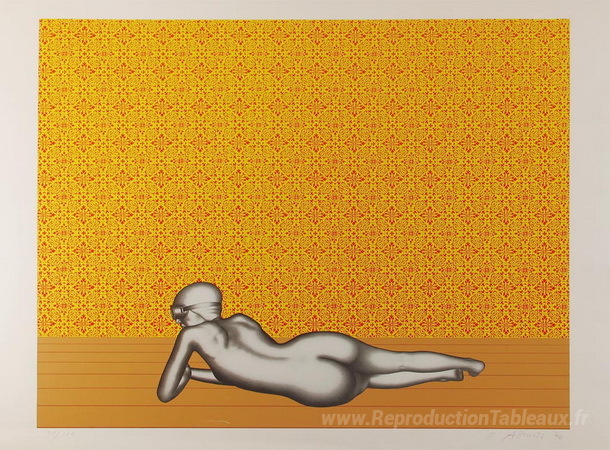 Nous vous proposons une reproduction artisanale sur toile du célèbre tableau 'Liegende ii vor tape' de Dieter Asmus, provenant du Musée de la Reproduction.