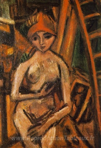 Nous vous proposons une reproduction artisanale sur toile du célèbre tableau 'Nu avec turban rouge' de Bela Czobel, provenant du Musée de la Reproduction.