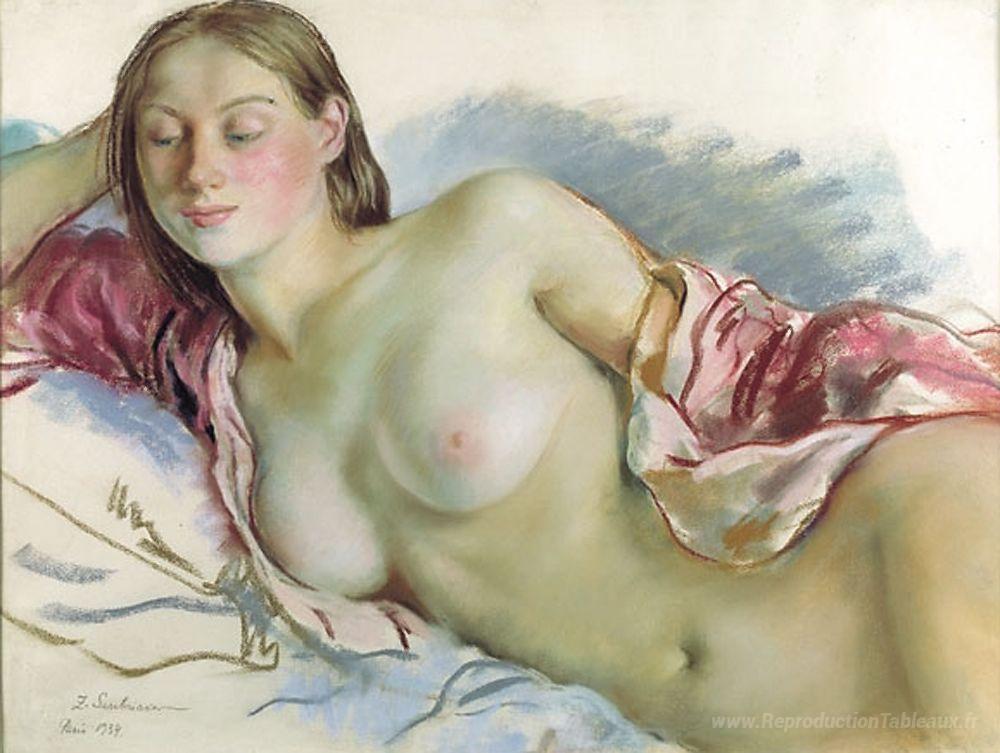 Nous vous proposons une reproduction artisanale sur toile du célèbre tableau 'Nu inclinable avec le manteau cerise' de Zinaida Serebriakova, provenant du Musée de la Reproduction.