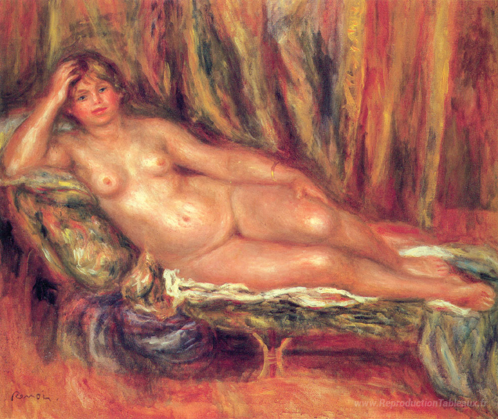 Nous vous proposons une reproduction artisanale sur toile du célèbre tableau 'Nu sur un canapé' de Pierre-Auguste Renoir, provenant du Musée de la Reproduction.