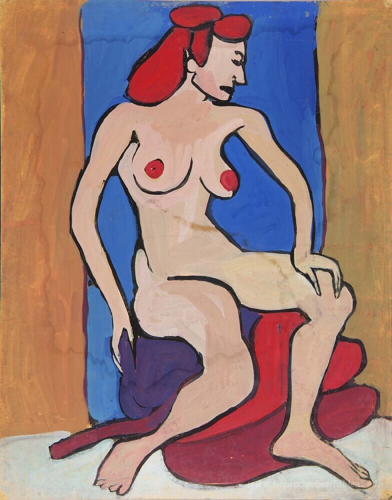 Nous vous proposons une reproduction artisanale sur toile du célèbre tableau 'Nude femelle aux cheveux roux assis sur des oreillers' de William H. Johnson, provenant du Musée de la Reproduction.