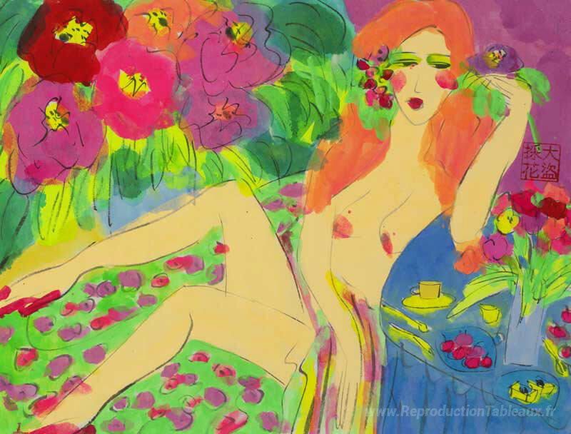 Nous vous proposons une reproduction artisanale sur toile du célèbre tableau 'Nude, table bleue et fleurs' de Walasse Ting, provenant du Musée de la Reproduction.