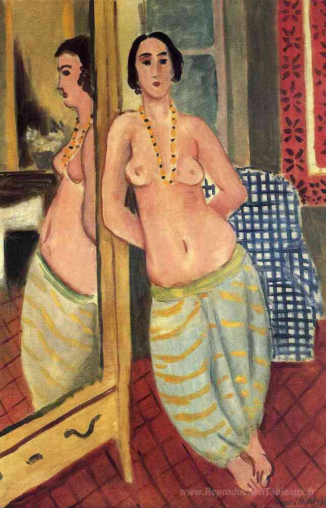 Nous vous proposons une reproduction artisanale sur toile du célèbre tableau 'Odalisque debout reflété dans un miroir' de Henri Matisse, provenant du Musée de la Reproduction.
