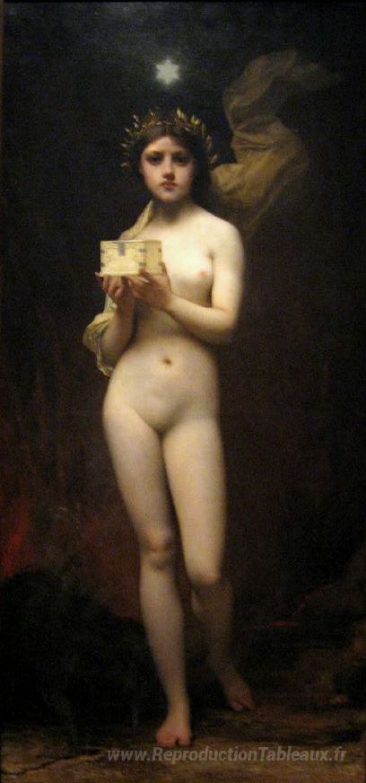 Nous vous proposons une reproduction artisanale sur toile du célèbre tableau 'Pandore' de Jules Joseph Lefebvre, provenant du Musée de la Reproduction.