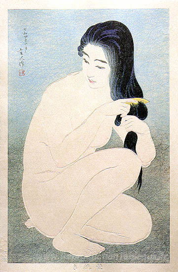Nous vous proposons une reproduction artisanale sur toile du célèbre tableau 'Peigner dans le bain' de Torii Kotondo, provenant du Musée de la Reproduction.