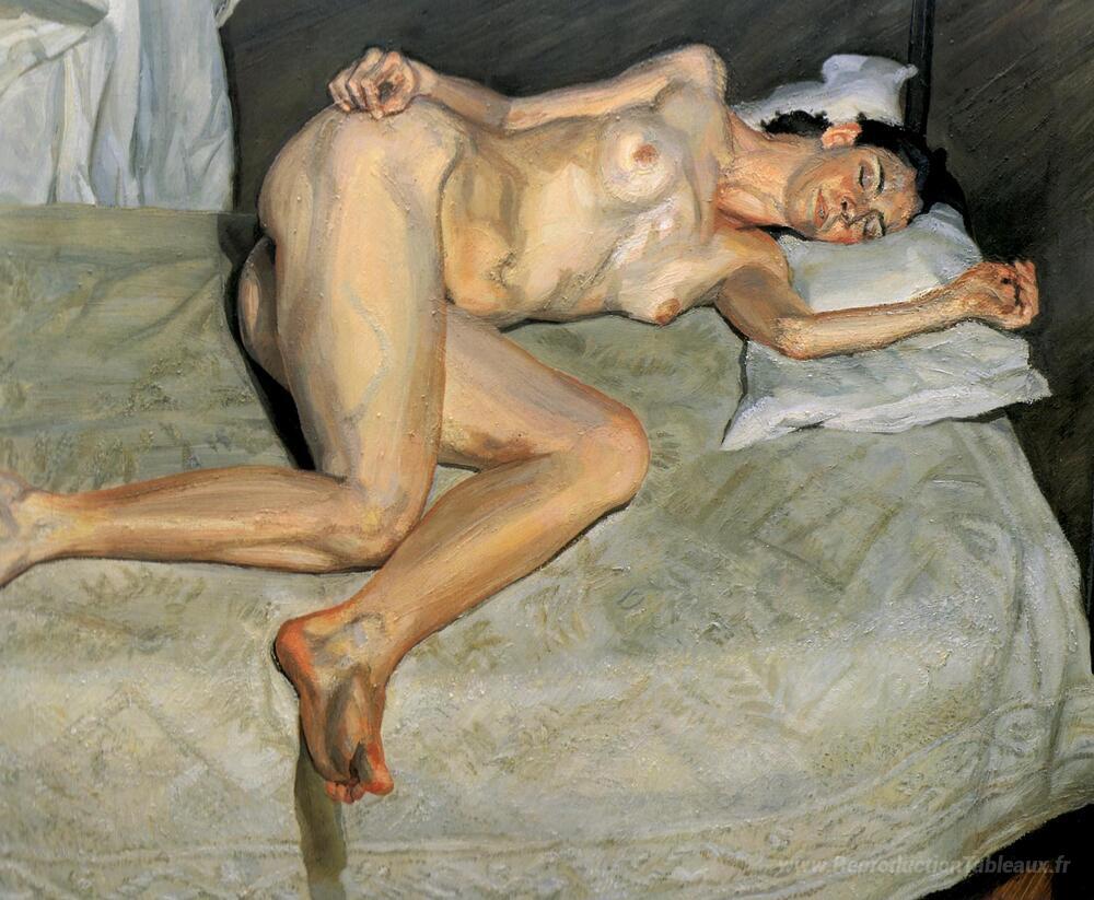Nous vous proposons une reproduction artisanale sur toile du célèbre tableau 'Portrait sur une couverture blanche' de Lucian Freud, provenant du Musée de la Reproduction.