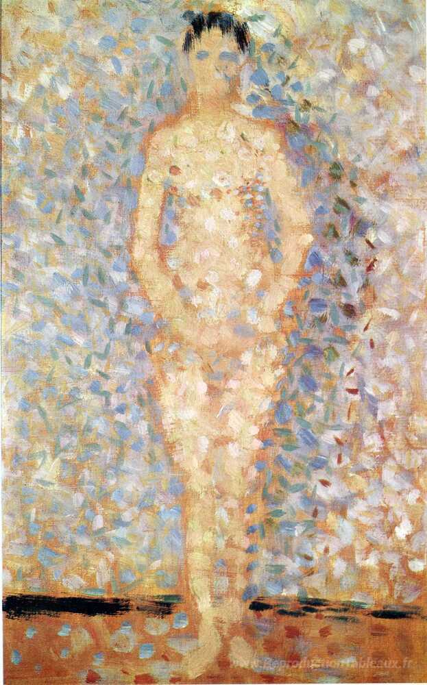 Nous vous proposons une reproduction artisanale sur toile du célèbre tableau 'Poseur Standing, Front View, étude pour "Les Poseus"' de Georges Seurat, provenant du Musée de la Reproduction.