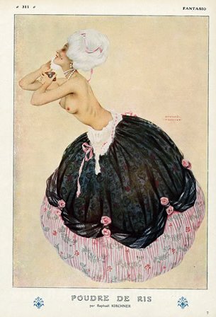 Nous vous proposons une reproduction artisanale sur toile du célèbre tableau 'Poudre de ris' de Raphael Kirchner, provenant du Musée de la Reproduction.