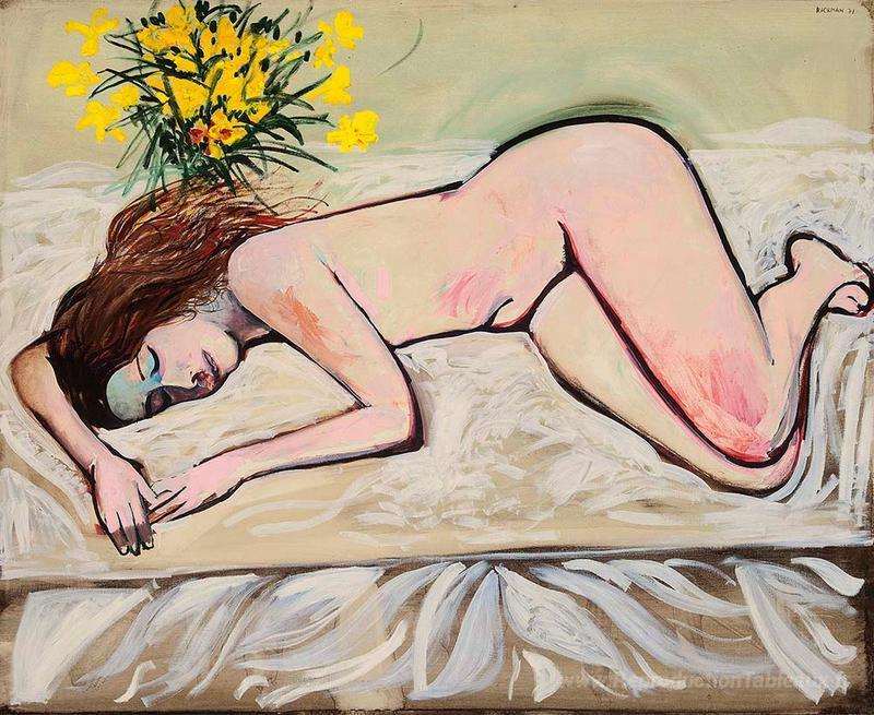 Nous vous proposons une reproduction artisanale sur toile du célèbre tableau 'Sans titre (nu avec des fleurs)' de Charles Blackman, provenant du Musée de la Reproduction.