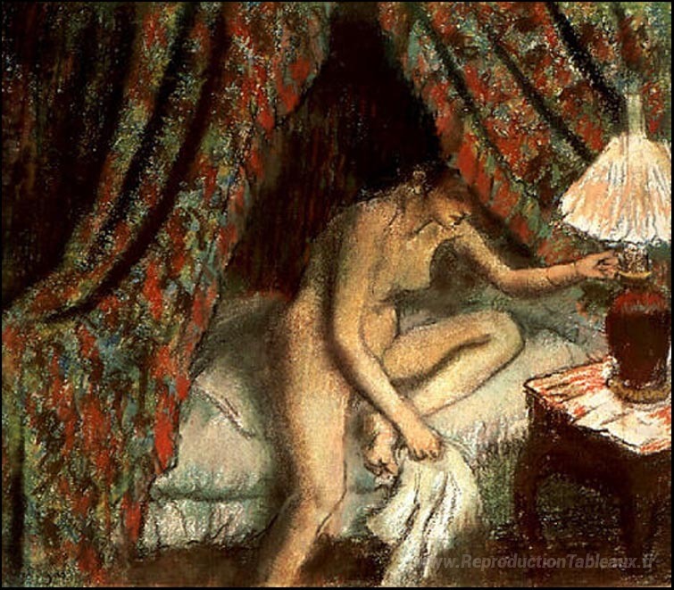 Nous vous proposons une reproduction artisanale sur toile du célèbre tableau 'Sortant' de Edgar Degas, provenant du Musée de la Reproduction.