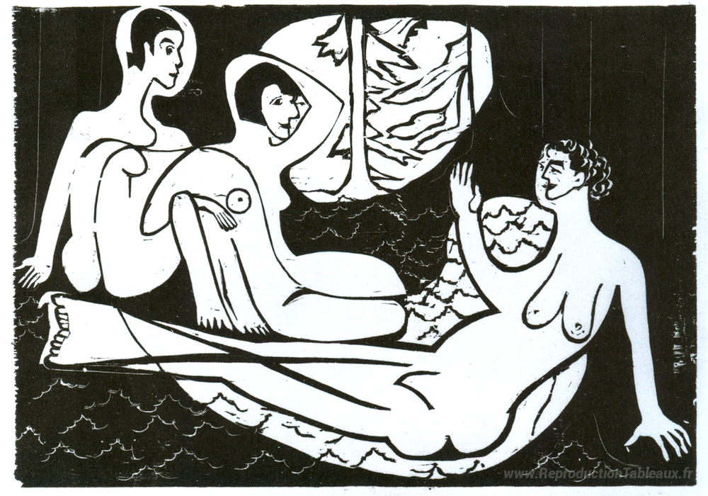 Nous vous proposons une reproduction artisanale sur toile du célèbre tableau 'Trois nus dans la forêt' de Ernst Ludwig Kirchner, provenant du Musée de la Reproduction.