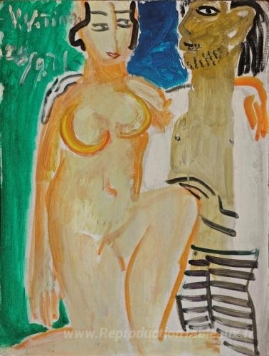 Nous vous proposons une reproduction artisanale sur toile du célèbre tableau 'Un artiste et son modèle' de Ding Yanyong, provenant du Musée de la Reproduction.