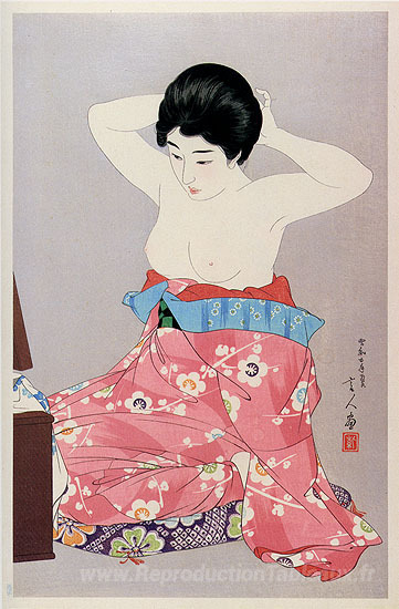 Nous vous proposons une reproduction artisanale sur toile du célèbre tableau 'Une femme avant le miroir' de Torii Kotondo, provenant du Musée de la Reproduction.