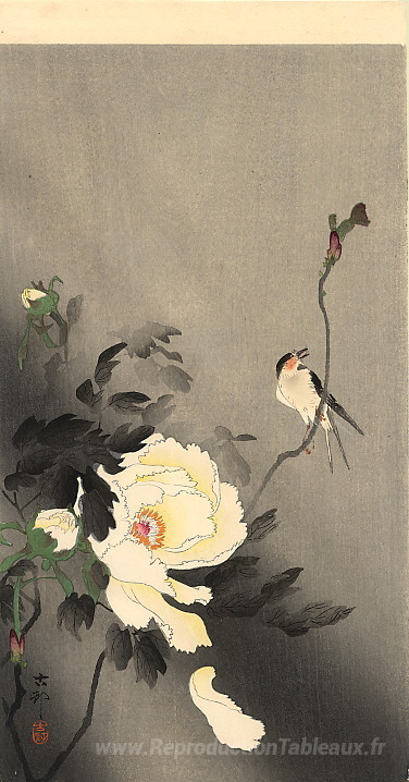Nous vous proposons une reproduction artisanale sur toile du célèbre tableau 'Avaler de pivoine' de Ohara Koson, provenant du Musée de la Reproduction.