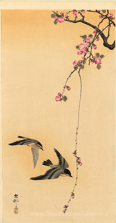 Nous vous proposons une reproduction artisanale sur toile du célèbre tableau 'Cherry Blossom avec des oiseaux' de Ohara Koson, provenant du Musée de la Reproduction.