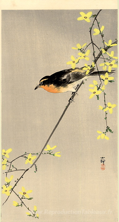 Nous vous proposons une reproduction artisanale sur toile du célèbre tableau 'Oiseau à poitrine orange' de Ohara Koson, provenant du Musée de la Reproduction.