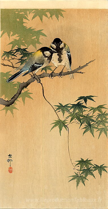 Nous vous proposons une reproduction artisanale sur toile du célèbre tableau 'Seins sur l'érable' de Ohara Koson, provenant du Musée de la Reproduction.