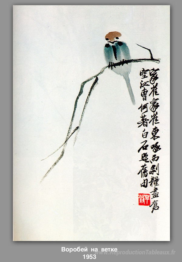 Nous vous proposons une reproduction artisanale sur toile du célèbre tableau 'Sparrow sur une branche' de Qi Baishi, provenant du Musée de la Reproduction.