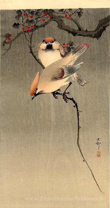 Nous vous proposons une reproduction artisanale sur toile du célèbre tableau 'Starlings et cerisier' de Ohara Koson, provenant du Musée de la Reproduction.
