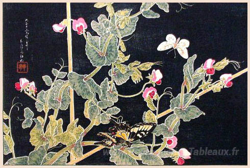 Nous vous proposons une reproduction artisanale sur toile du célèbre tableau 'Sweetpeas et papillons' de Shotei Takahashi, provenant du Musée de la Reproduction.