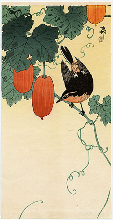 Nous vous proposons une reproduction artisanale sur toile du célèbre tableau 'Un mouche à mouche sur le buisson de concombre' de Ohara Koson, provenant du Musée de la Reproduction.