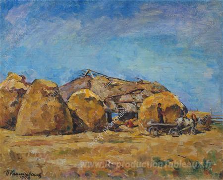 Nous vous proposons une reproduction artisanale sur toile du célèbre tableau 'À la grange' de Pyotr Konchalovsky, provenant du Musée de la Reproduction.
