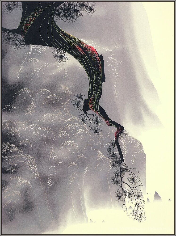 Nous vous proposons une reproduction artisanale sur toile du célèbre tableau 'À travers le brouillard' de Eyvind Earle, provenant du Musée de la Reproduction.