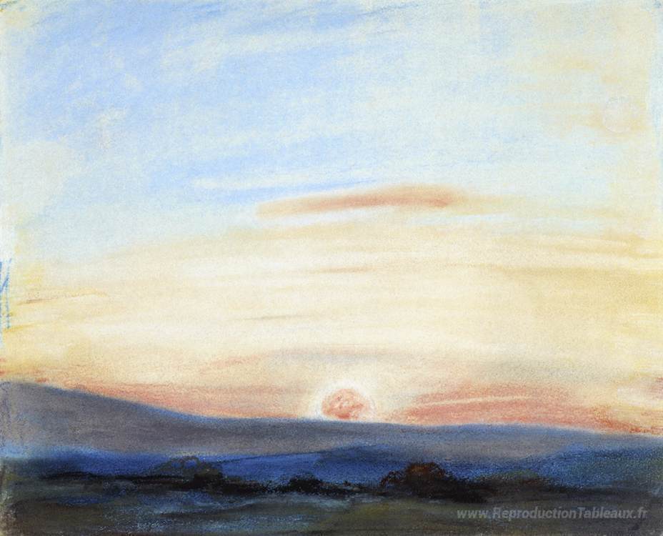Nous vous proposons une reproduction artisanale sur toile du célèbre tableau 'Étude du ciel, coucher du soleil' de Eugene Delacroix, provenant du Musée de la Reproduction.