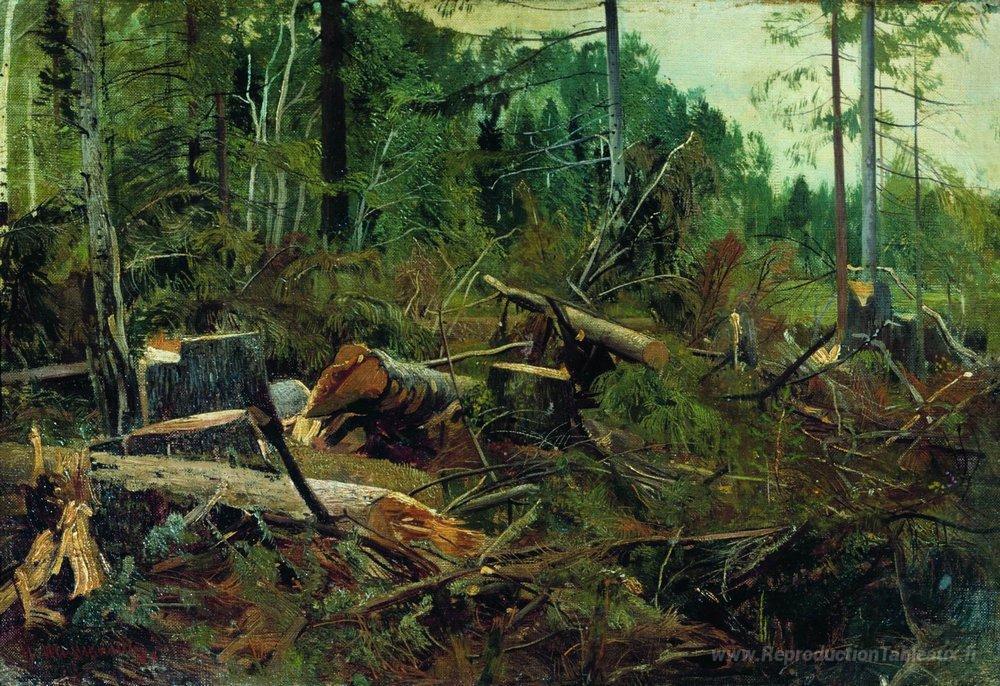 Nous vous proposons une reproduction artisanale sur toile du célèbre tableau 'Abattage' de Ivan Shishkin, provenant du Musée de la Reproduction.