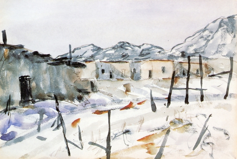 Nous vous proposons une reproduction artisanale sur toile du célèbre tableau 'Adobes de Santa Fe' de Robert Henri, provenant du Musée de la Reproduction.