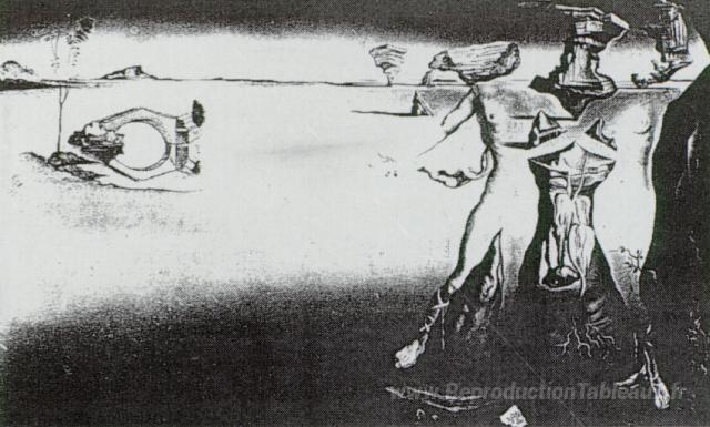 Nous vous proposons une reproduction artisanale sur toile du célèbre tableau 'Apparition d'un couple dans le désert' de Salvador Dali, provenant du Musée de la Reproduction.