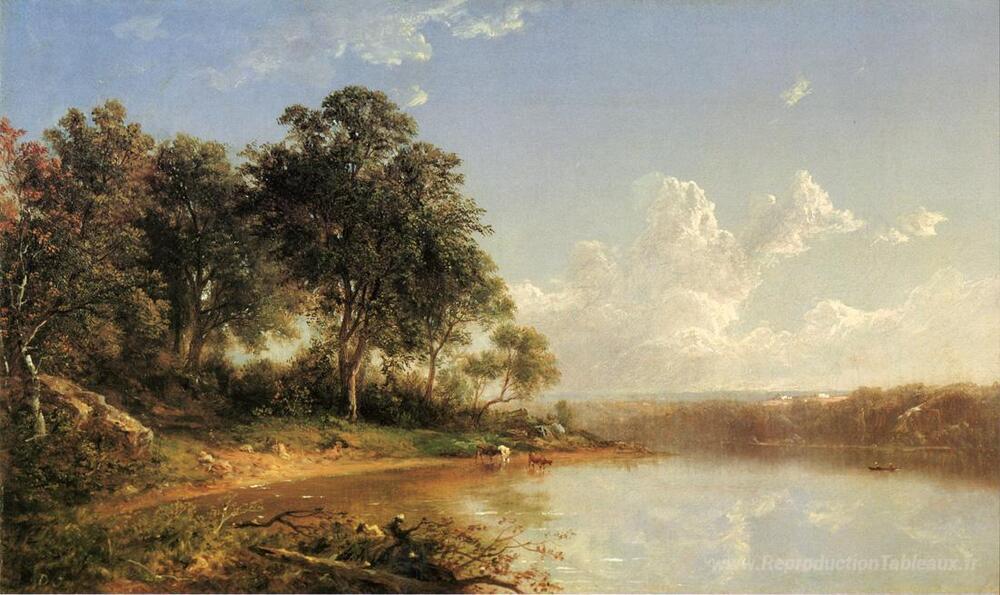 Nous vous proposons une reproduction artisanale sur toile du célèbre tableau 'Après-midi le long des rives d'une rivière' de David Johnson, provenant du Musée de la Reproduction.