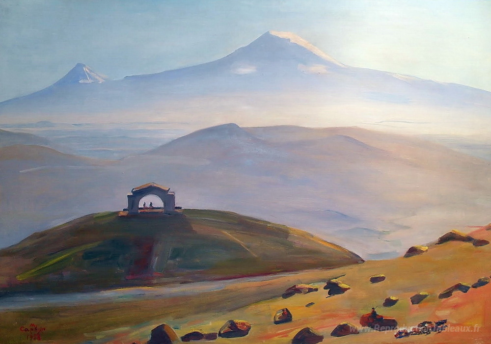 Nous vous proposons une reproduction artisanale sur toile du célèbre tableau 'Ararat et Arch.' de Martiros Saryan, provenant du Musée de la Reproduction.