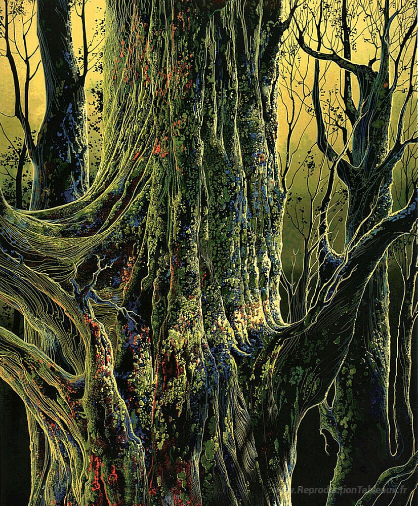 Nous vous proposons une reproduction artisanale sur toile du célèbre tableau 'Arbre ancien' de Eyvind Earle, provenant du Musée de la Reproduction.