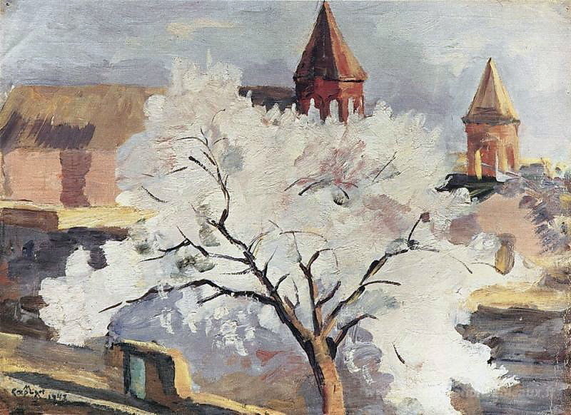Nous vous proposons une reproduction artisanale sur toile du célèbre tableau 'Arbre d'abricot en fleur' de Martiros Saryan, provenant du Musée de la Reproduction.