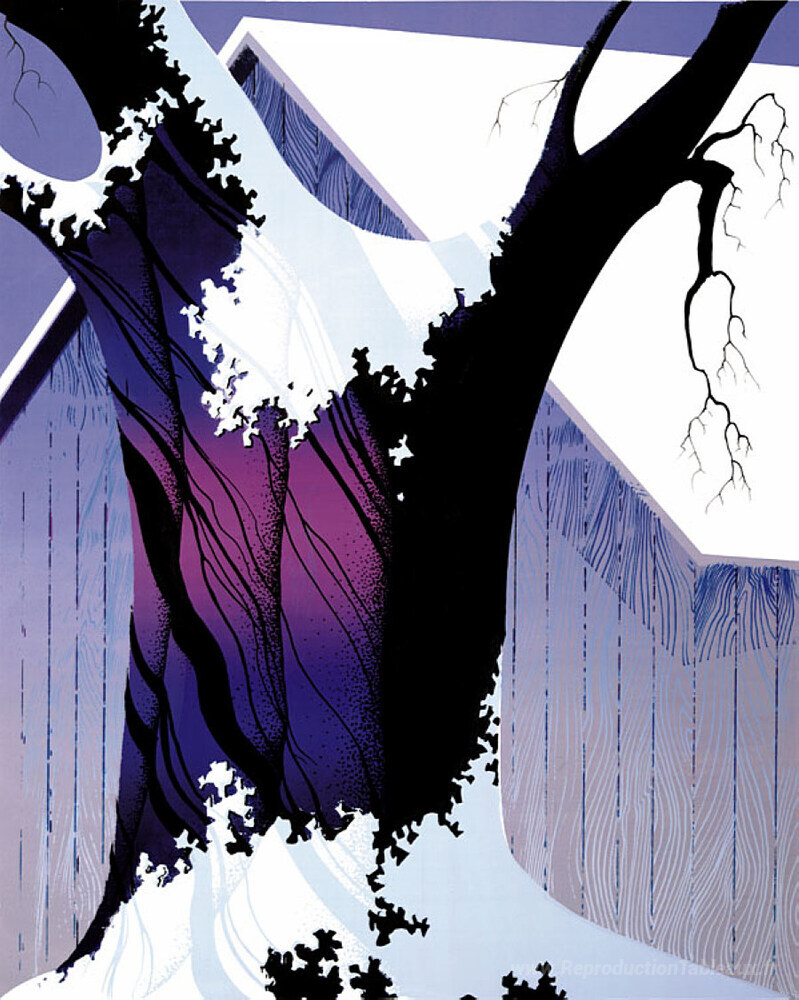 Nous vous proposons une reproduction artisanale sur toile du célèbre tableau 'Arbre violet et grange' de Eyvind Earle, provenant du Musée de la Reproduction.