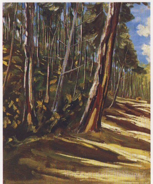 Nous vous proposons une reproduction artisanale sur toile du célèbre tableau 'Arbres à Mimizan' de Winston Churchill, provenant du Musée de la Reproduction.