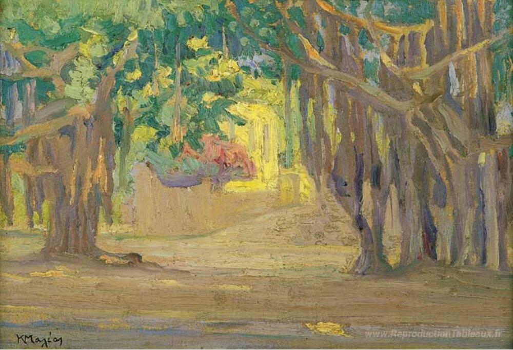 Nous vous proposons une reproduction artisanale sur toile du célèbre tableau 'Arbres au Caire' de Constantine Maleas, provenant du Musée de la Reproduction.