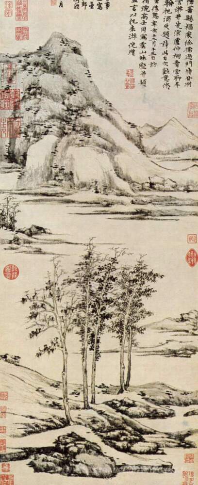 Nous vous proposons une reproduction artisanale sur toile du célèbre tableau 'Arbres dans une vallée de la rivière à Yü Shan' de Ni Zan, provenant du Musée de la Reproduction.