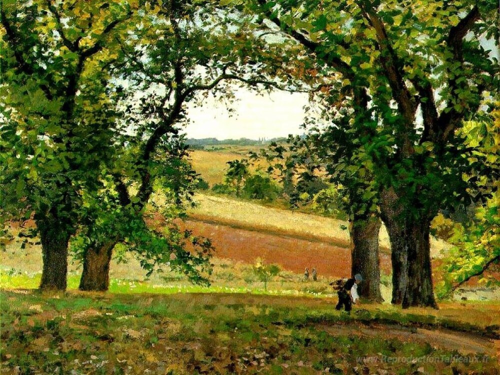 Nous vous proposons une reproduction artisanale sur toile du célèbre tableau 'Arbres de châtaignes à Osny' de Camille Pissarro, provenant du Musée de la Reproduction.