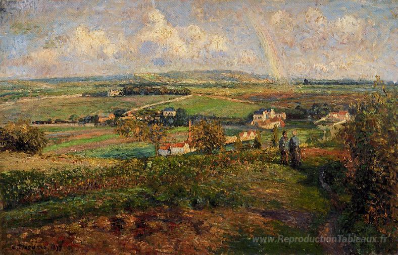 Nous vous proposons une reproduction artisanale sur toile du célèbre tableau 'Arc-en-ciel, pontoise' de Camille Pissarro, provenant du Musée de la Reproduction.