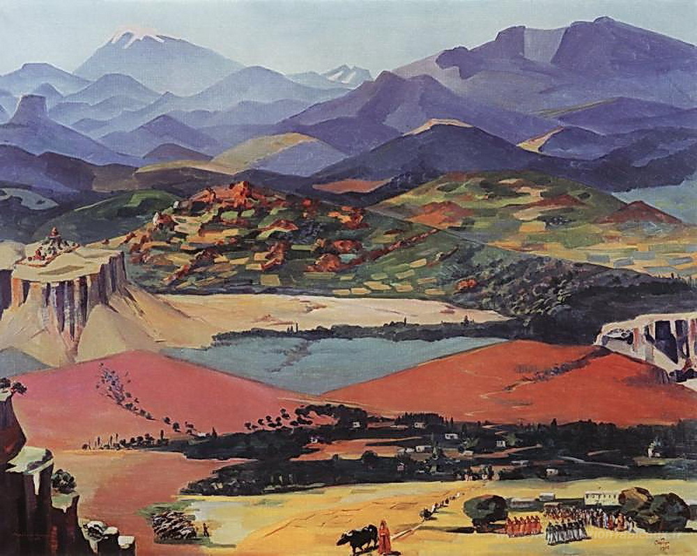 Nous vous proposons une reproduction artisanale sur toile du célèbre tableau 'Arménie' de Martiros Saryan, provenant du Musée de la Reproduction.