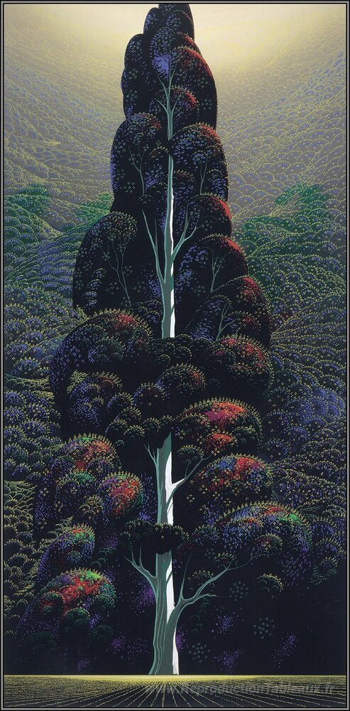 Nous vous proposons une reproduction artisanale sur toile du célèbre tableau 'Atteindre le ciel' de Eyvind Earle, provenant du Musée de la Reproduction.