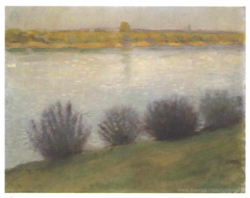 Nous vous proposons une reproduction artisanale sur toile du célèbre tableau 'Au Rhin près de Hersel' de August Macke, provenant du Musée de la Reproduction.