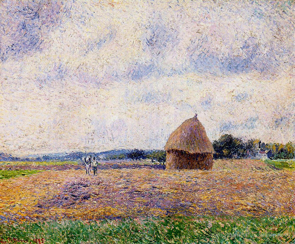 Nous vous proposons une reproduction artisanale sur toile du célèbre tableau 'Back de foin eragny' de Camille Pissarro, provenant du Musée de la Reproduction.
