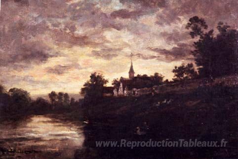 Nous vous proposons une reproduction artisanale sur toile du célèbre tableau 'Banques de l'Oise' de Charles-Francois Daubigny, provenant du Musée de la Reproduction.