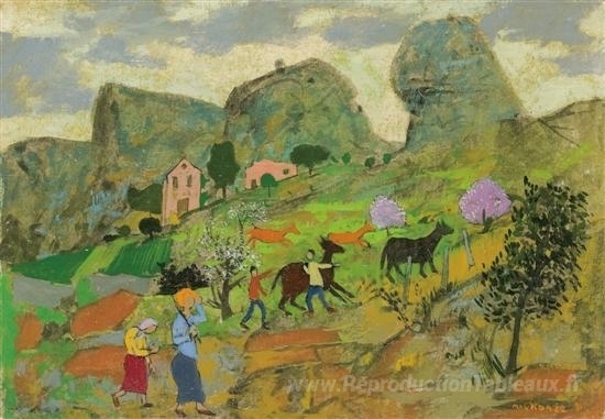 Nous vous proposons une reproduction artisanale sur toile du célèbre tableau 'Bergers dans la vallée' de Grégoire Michonze, provenant du Musée de la Reproduction.
